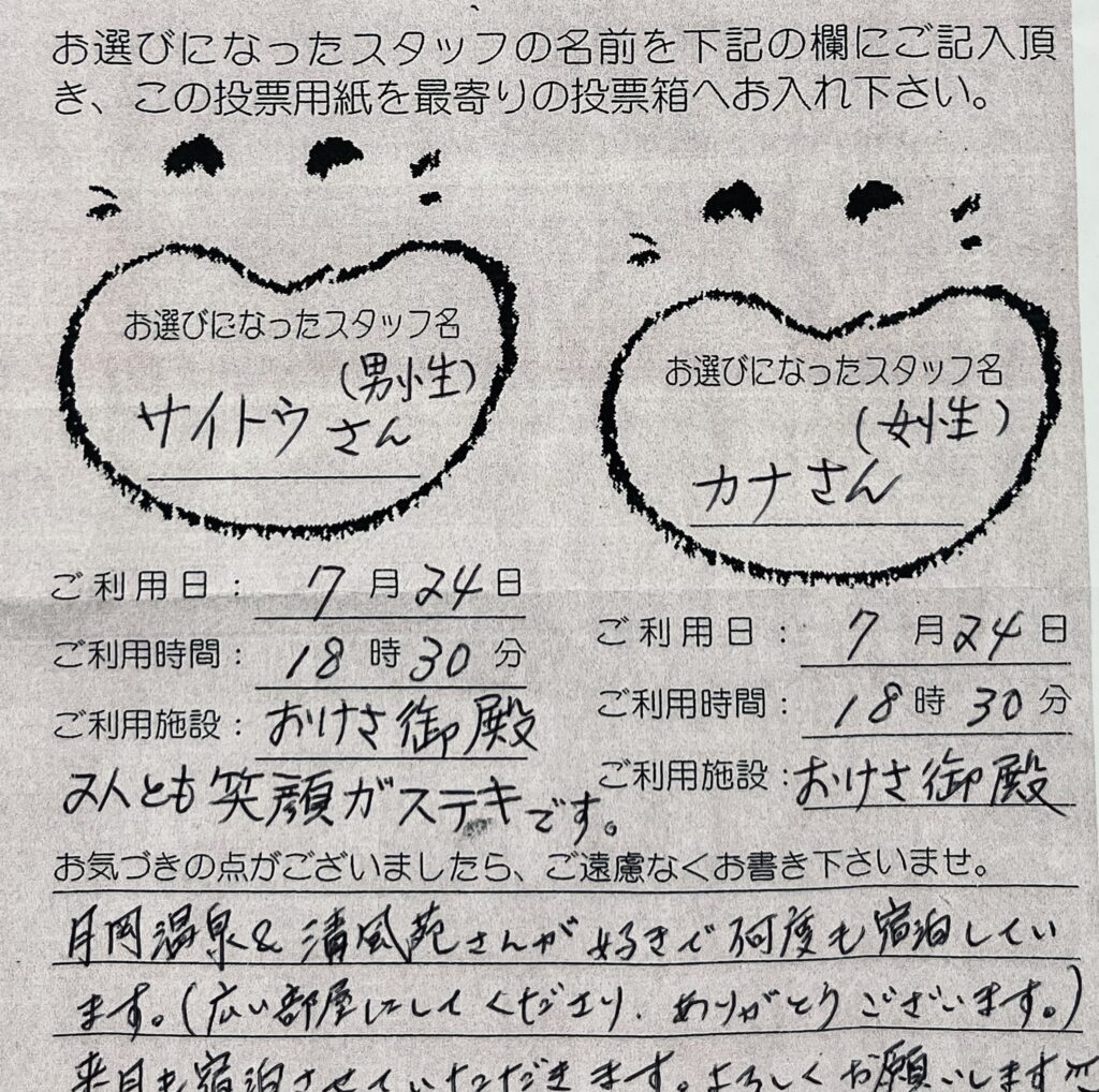 「笑顔がステキ」「月岡温泉&清風苑さんが好きで何度も宿泊しています」