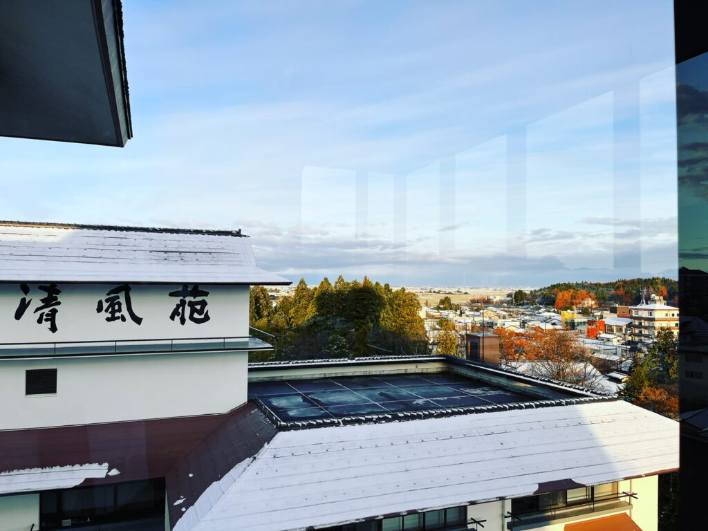 初雪です。月岡温泉に冬将軍が到来。温泉街も白くなりました。