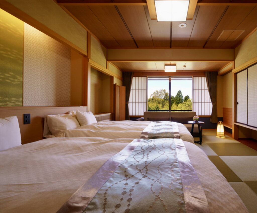 6階にあります、和室の12畳タイプの客室を和モダンベットルームに改装をいたしました。